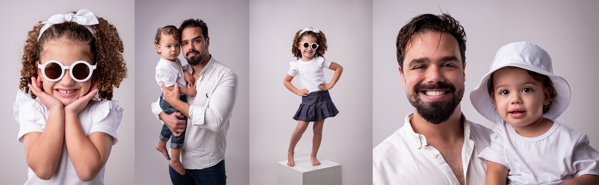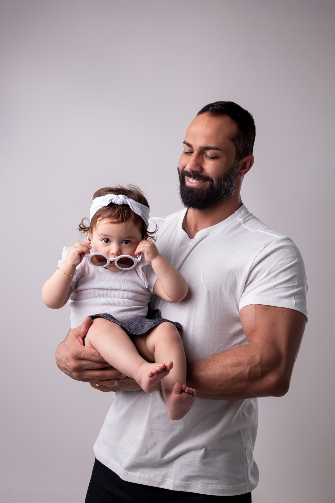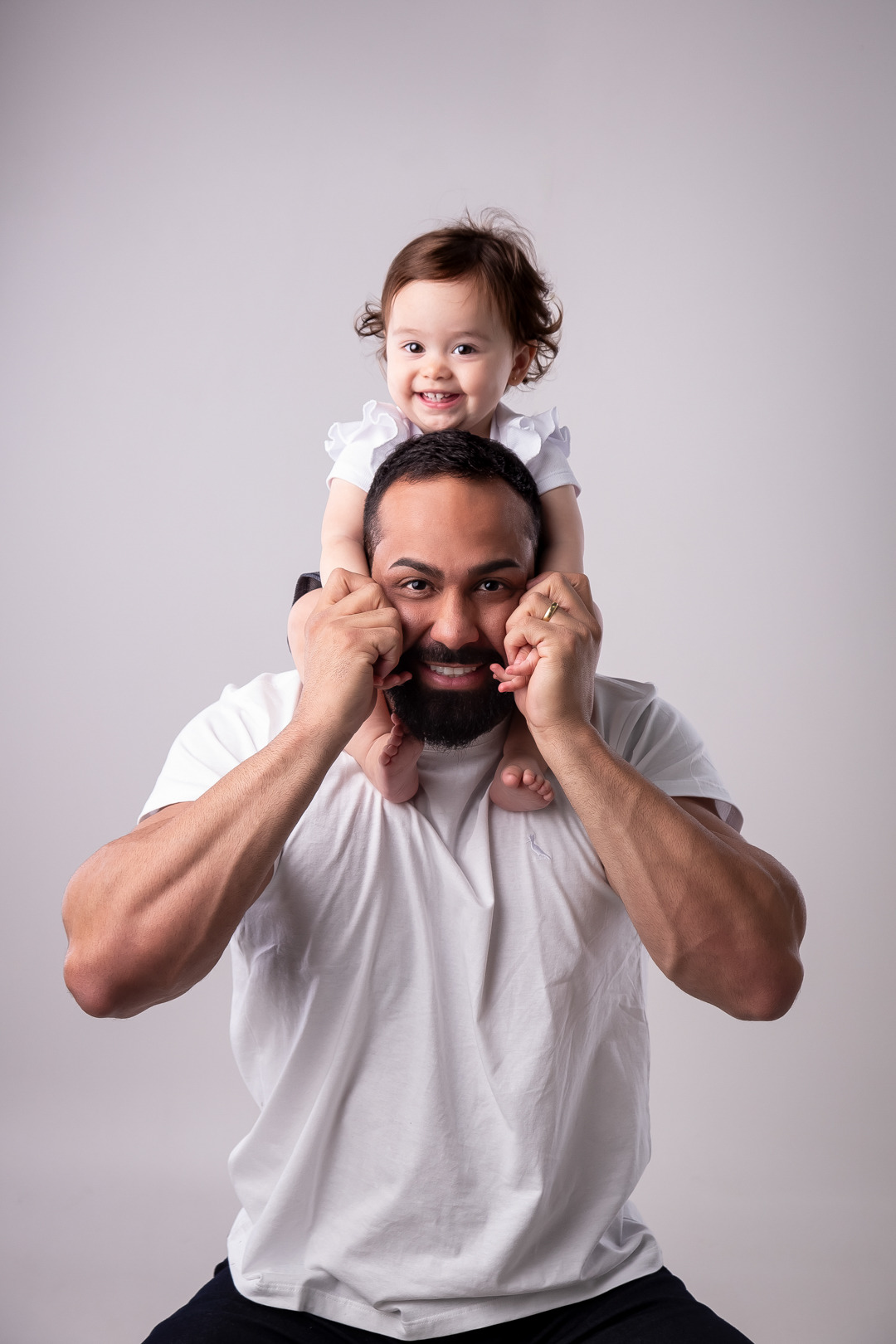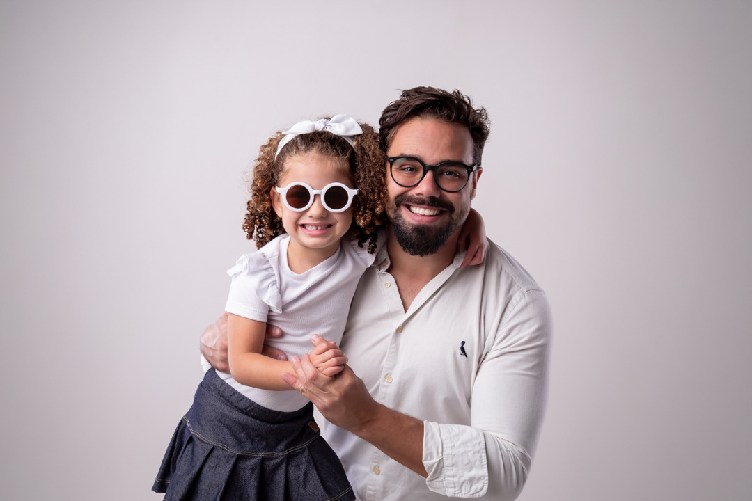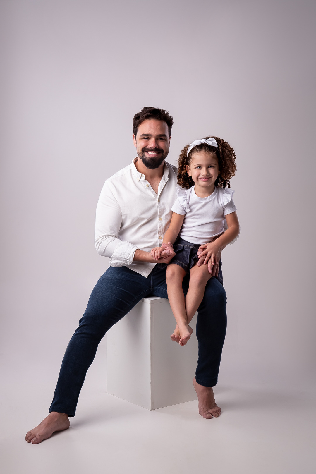 Ideal para quem gosta de fotos atemporais e marcantes. Um cenário limpo, com fundo claro, onde o que brilha são os sorrisos, os olhares e o carinho entre pai e filho(a). Perfeito para quem quer um resultado elegante, minimalista e cheio de afeto.