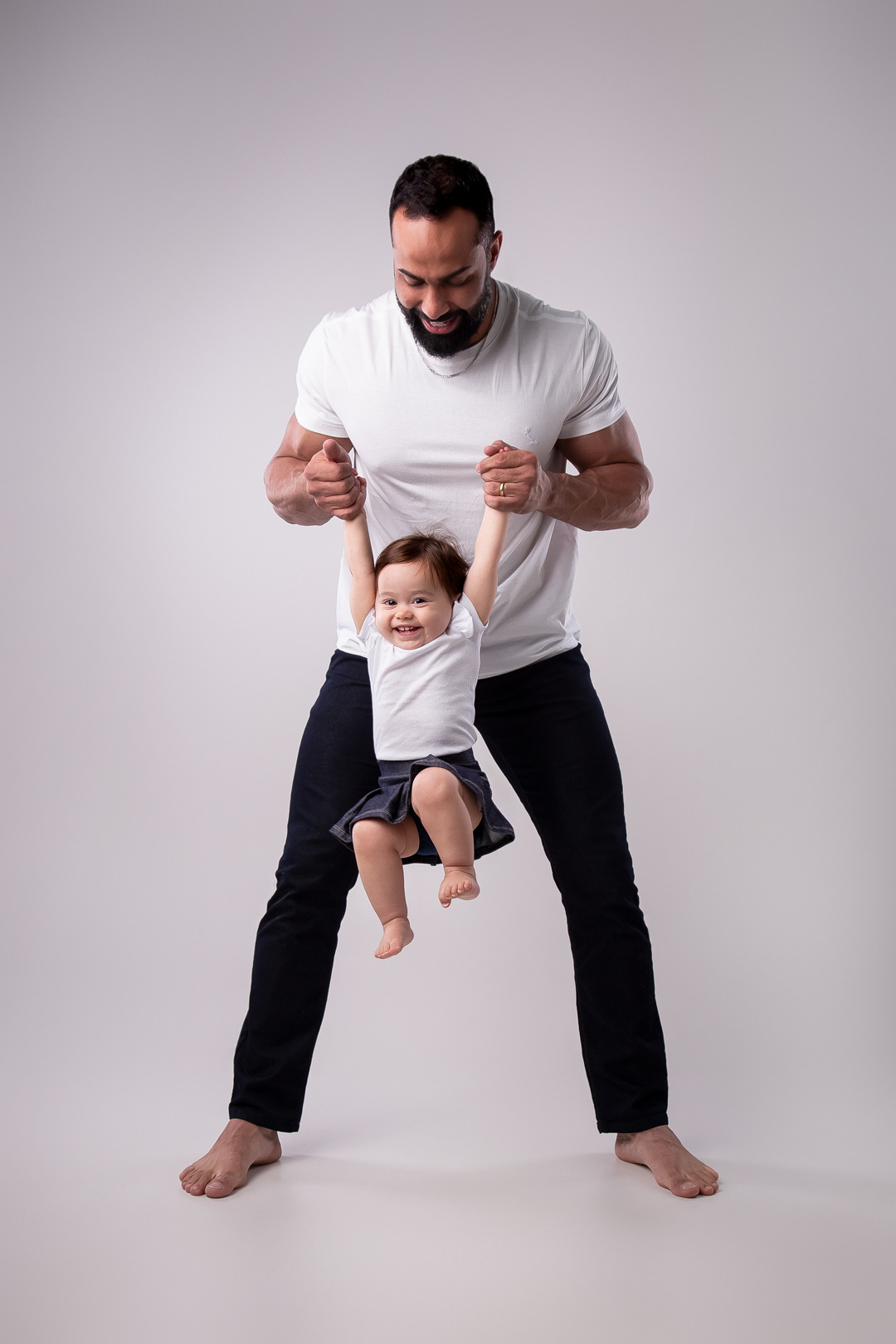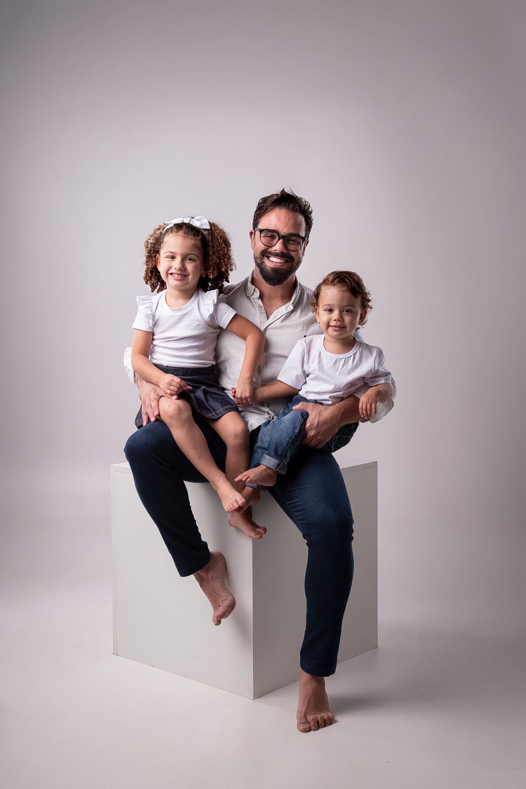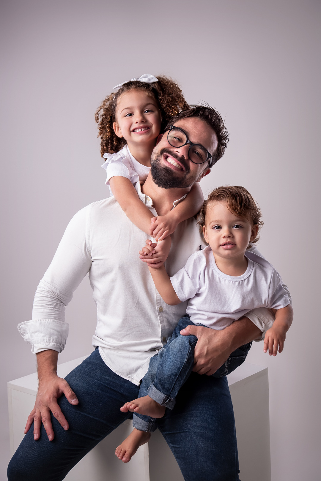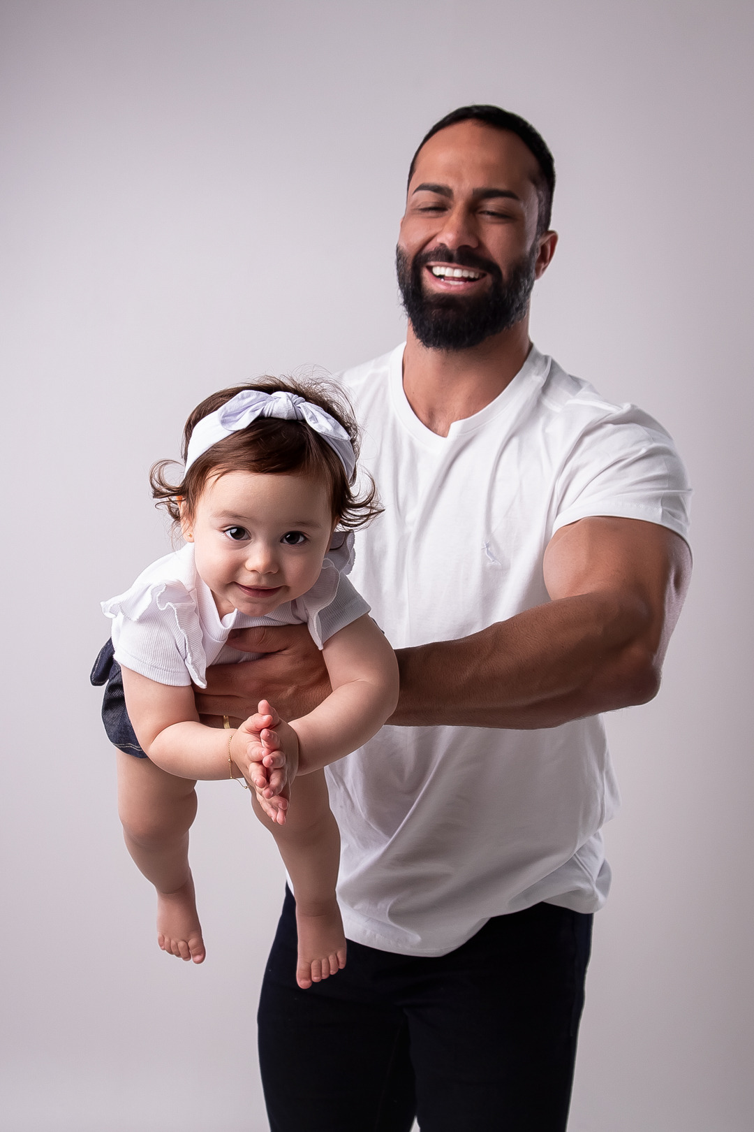 Ideal para quem gosta de fotos atemporais e marcantes. Um cenário limpo, com fundo claro, onde o que brilha são os sorrisos, os olhares e o carinho entre pai e filho(a). Perfeito para quem quer um resultado elegante, minimalista e cheio de afeto.