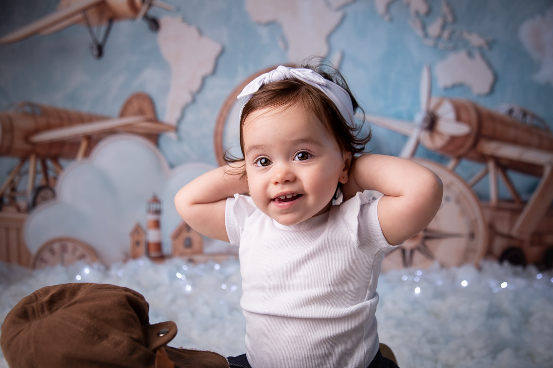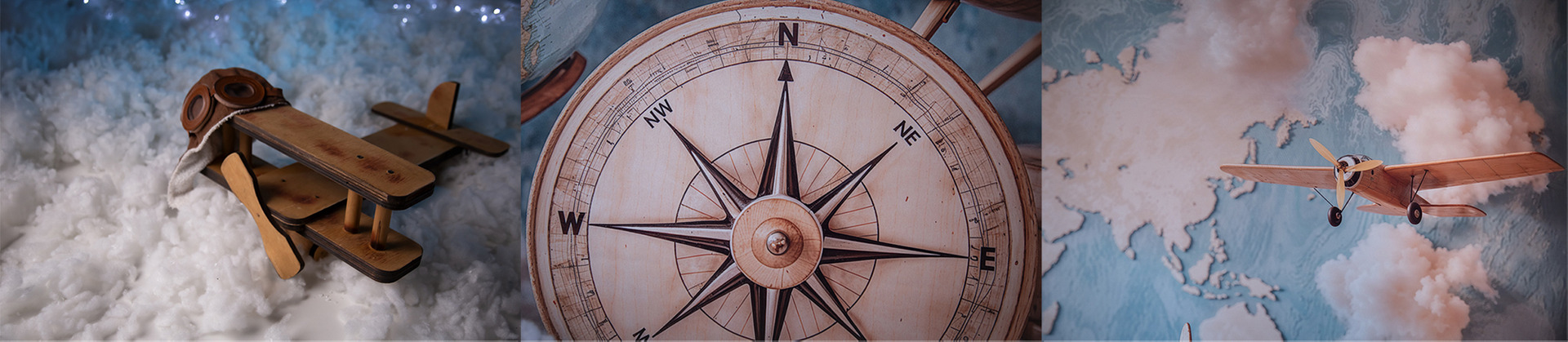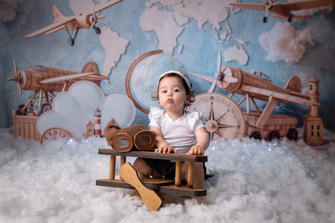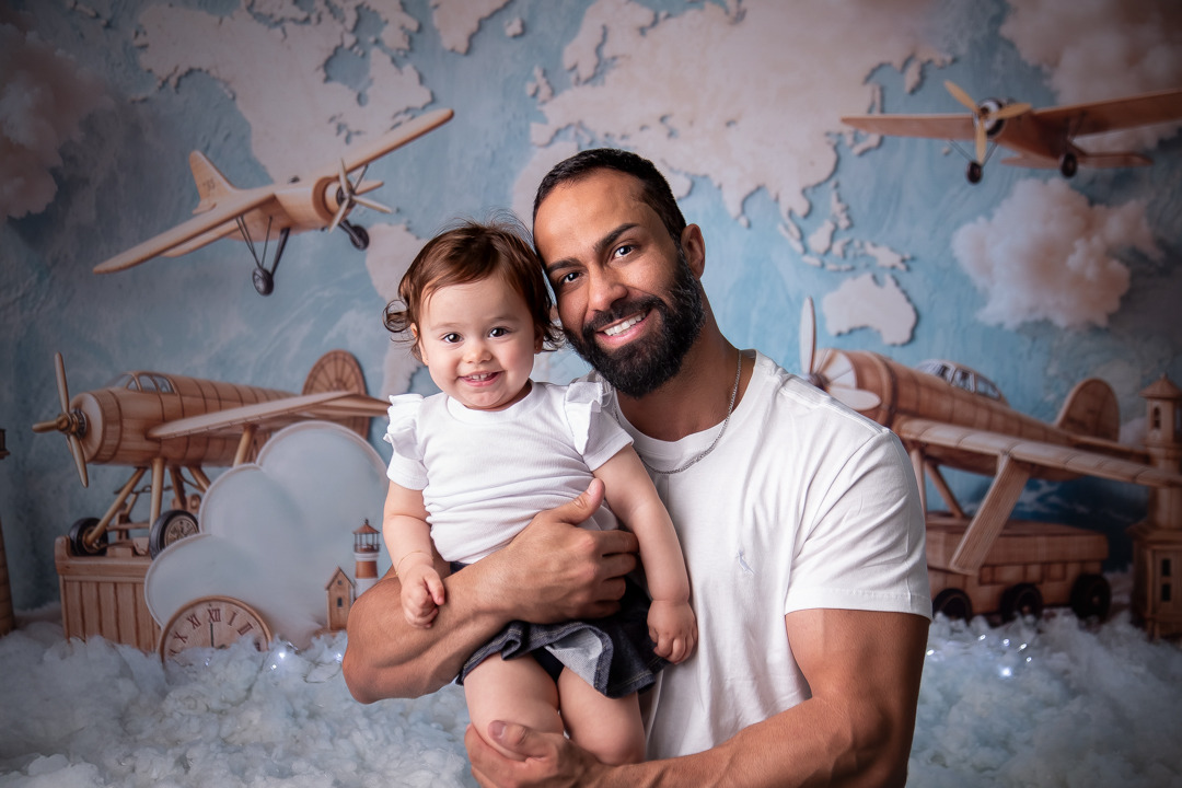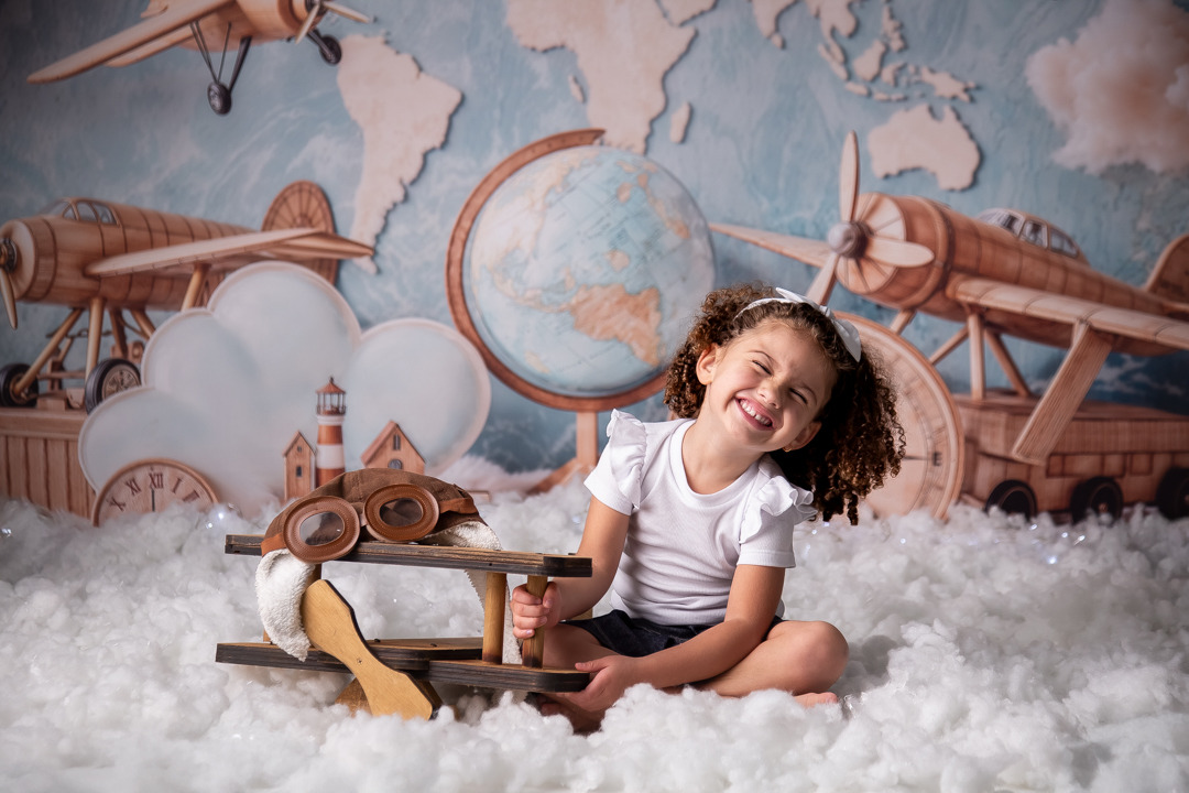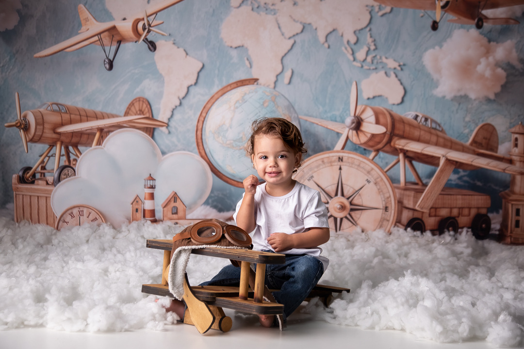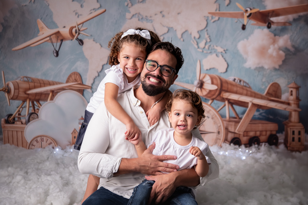 Para quem quer mergulhar de verdade na proposta do ensaio! Um ambiente colorido e divertido com aviões, nuvens, mapas e elementos que remetem a uma grande aventura no céu. Traz um toque de fantasia e imaginação às fotos, sem perder a delicadeza e o foco no amor paterno.